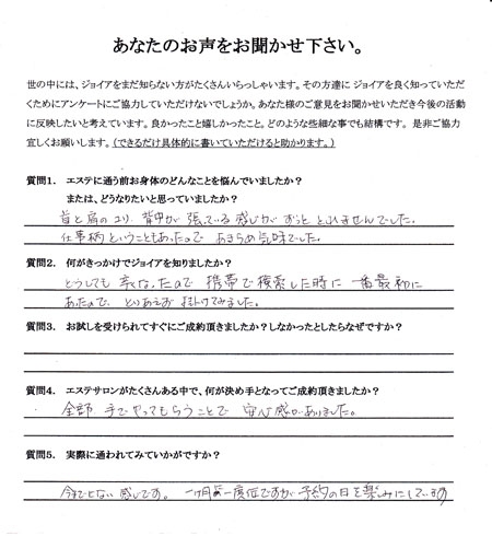 - 首と肩のコリ、背中が張っている感じがずっととれませんでした。仕事柄ということもあったので、あきらめ気味でした。