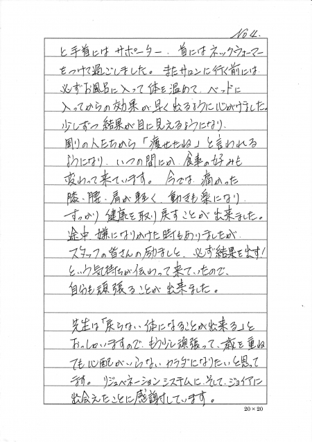先生は、「戻らない体になることが出来る」とおっしゃいますので、もう少し頑張って、歳を重ねても心配がいらないカラダになりたいと思っています。
